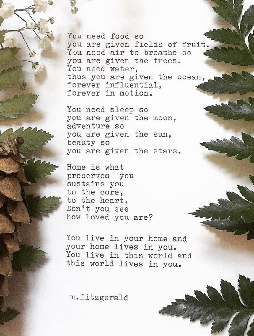 11″ x 14″ Canvas: You need food so you are given fields of fruit. You need air to breathe so you are given the trees. You need water, thus you are given the ocean. Forever influential, forever in motion. You need sleep so you are given the moon, adventure so you are given the sun, beauty so you are given the stars. Home is what preserves you, sustains you to the core, to the heart. Don’t you see how loved you are? You live in your home and your home lives in you. You live in this world and this world lives in you.