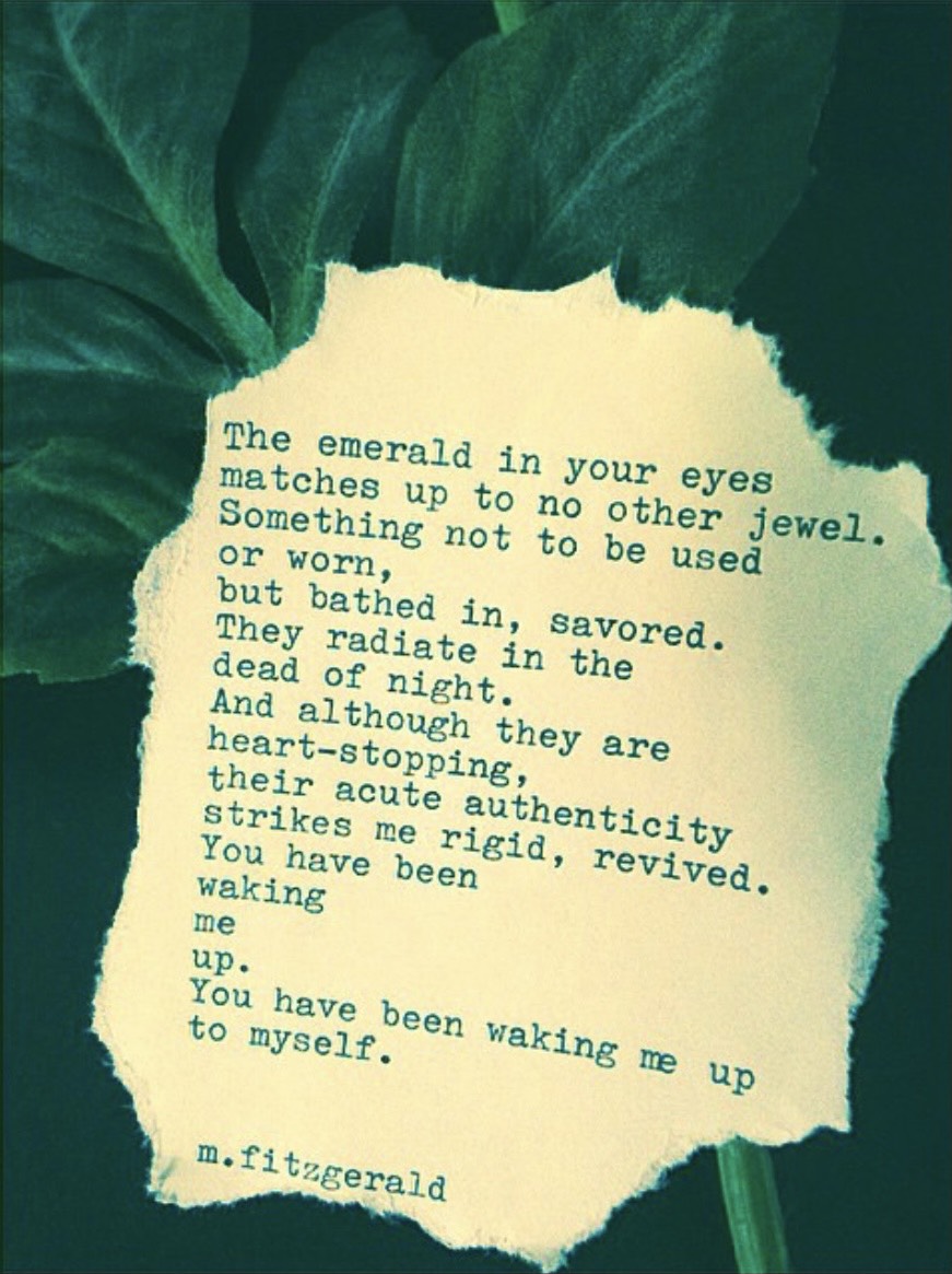 11″ x 14″ Canvas: The Emerald in your eyes matches up to no other jewel. Something not to be used or worn, but bathed in, savored. They radiate in the dead of night. And although they are heart-stopping, their acute authenticity strikes me rigid, revived. You have been waking me up. You have been waking me up to myself.