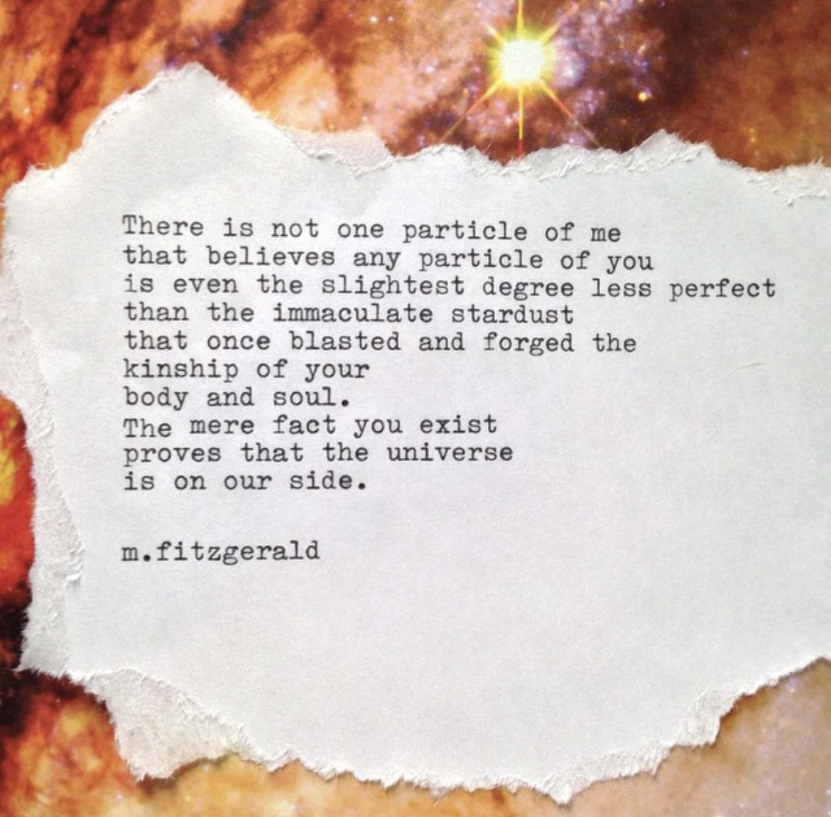 11″ x 14″ Canvas: There is not one particle of me that believes any particle of you is even the slightest degree less perfect than the immaculate stardust that once blasted and forged the kinship of your body and soul. The mere fact you exist proves that the universe is on our side.