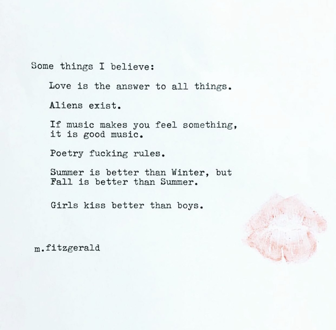 11″ x 14″ Canvas: Some things I believe: Love is the answer to all things. Aliens exist. If music makes you feel something, it is good music. Poetry fucking rules. Summer is better than Winter, but Fall is better than Summer. Girls kiss better than boys.