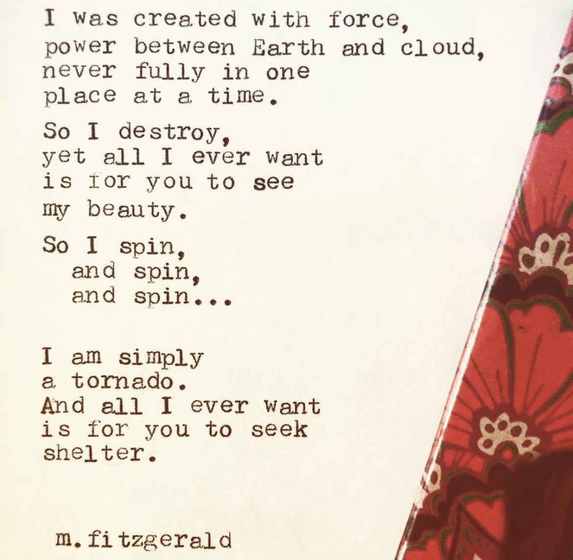11″ x 14″ Canvas: I was created with force, power between Earth and cloud, never fully in one place at a time. So I destroy, yet all I ever want is for you to see my beauty. So I spin, and spin, and spin…I am simply a tornado, and all I ever want is for you to seek shelter.