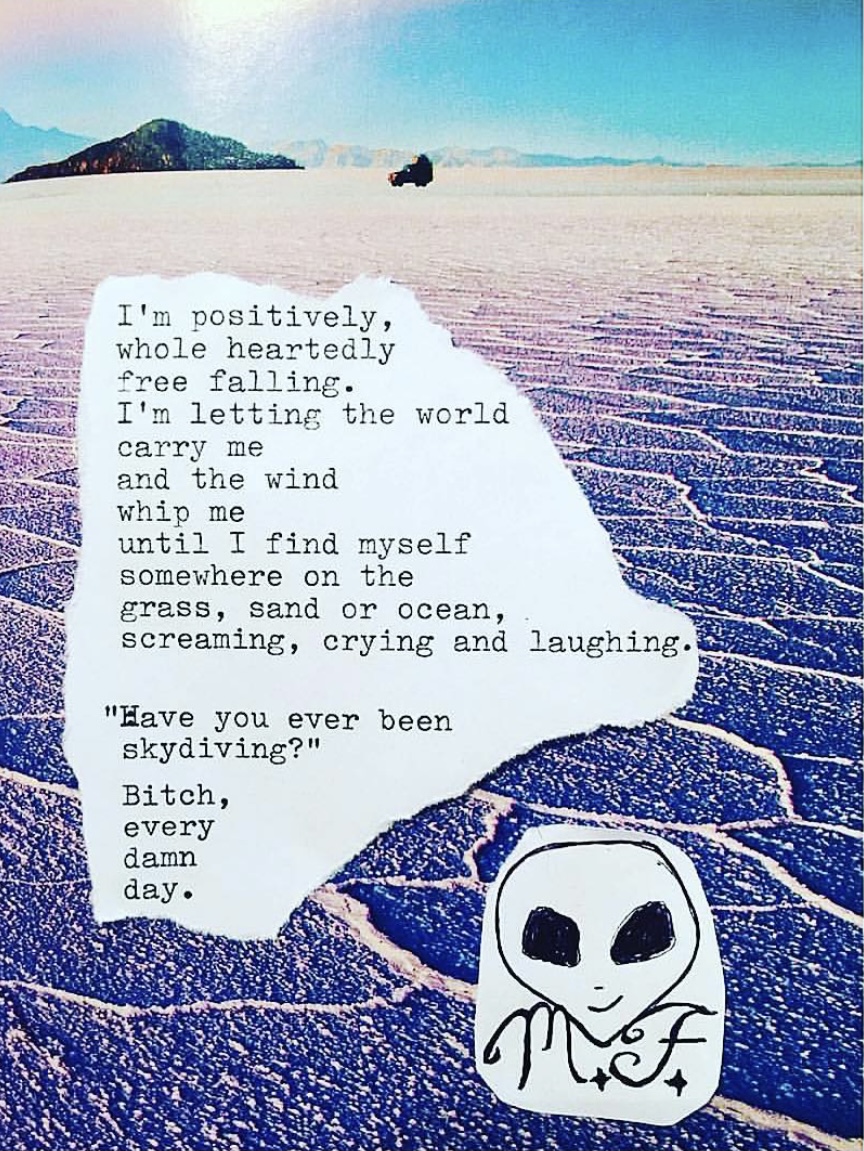 11″ x 14″ Canvas: I’m positively, wholeheartedly free falling. I’m letting the world carry me and the wind whip me until I find myself somewhere on the grass, sand or ocean, screaming, crying, and laughing. “Have you ever been skydiving?” Bitch, every damn day.