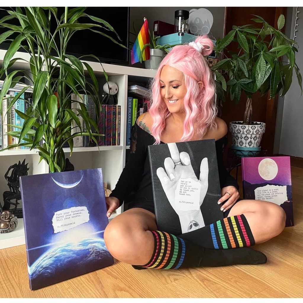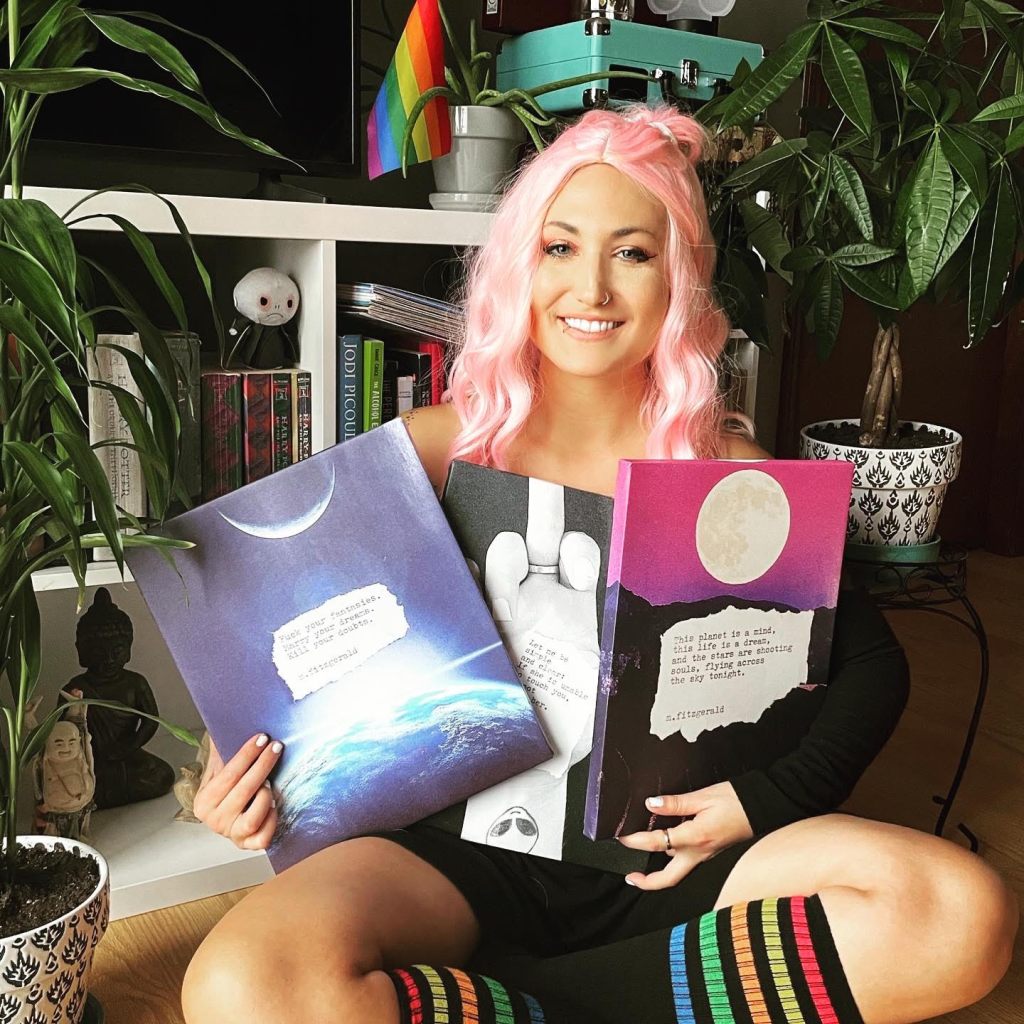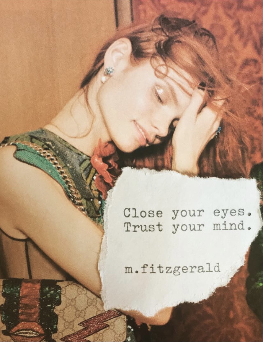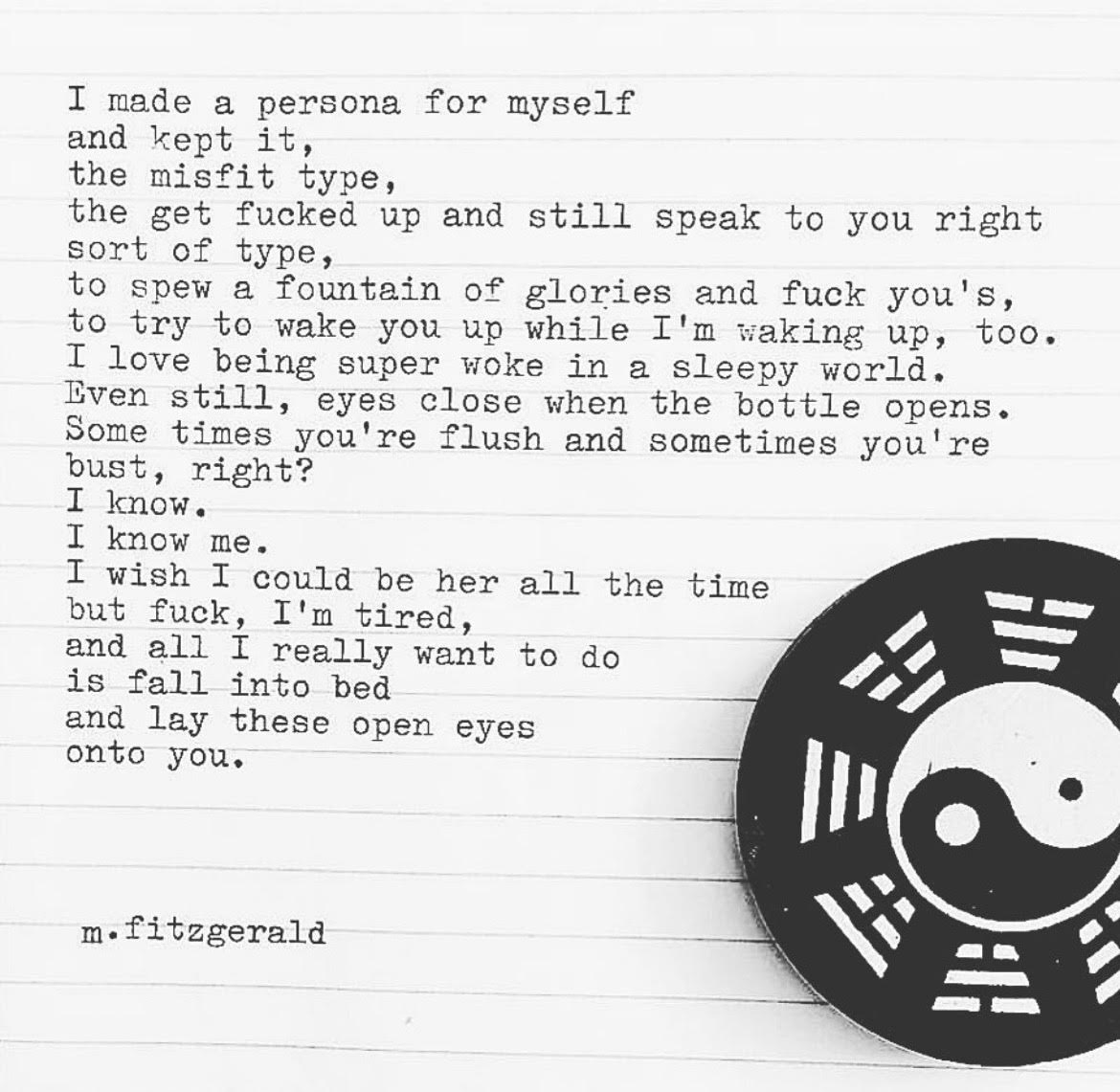 11″ x 14″ Canvas: I made a persona for myself and kept it, the misfit type, the get fucked up and still speak to you right sort of type, to spew a fountain of glories and fuck you’s, to try to wake you up while I’m waking up, too. I love being super woke in a sleepy world. Even still, eyes close when the bottle opens. Some times you’re flush and some times you’re bust, right? I know. I know me. I wish I could be her all the time but fuck, I’m tired. And all I really want to do is fall into bed and lay these open eyes onto you.